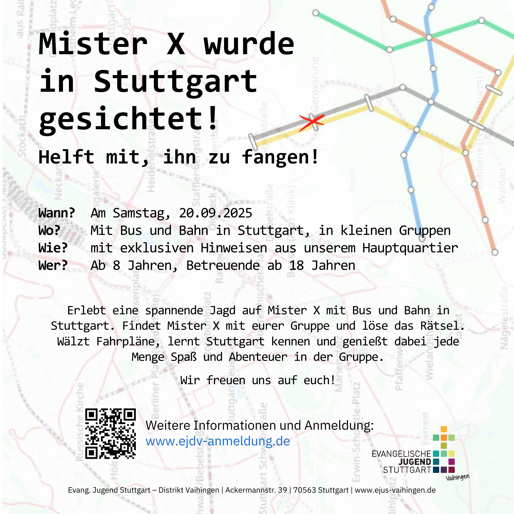 Findet Mister X mit eurer Gruppe und löst das Rätsel. Wälzt Fahrpläne, lernt Stuttgart kennen und genießt dabei jede Menge Spaß und Abenteuer in eurer Gruppe.