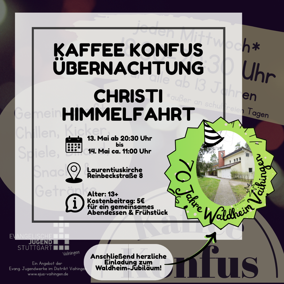 Am Mittwoch, 28. Mai 2025 bieten wir in der Laurentiuskirche ein Kaffee Konfus Übernachtungsspecial an! Um 20:30 Uhr endet das offene Angebot und das Programm des Specials wird beginnen. Danach werden wir in den Jugendräumen übernachten. Wir organisieren für alle Angemeldeten ein gemeinsames Abendessen!