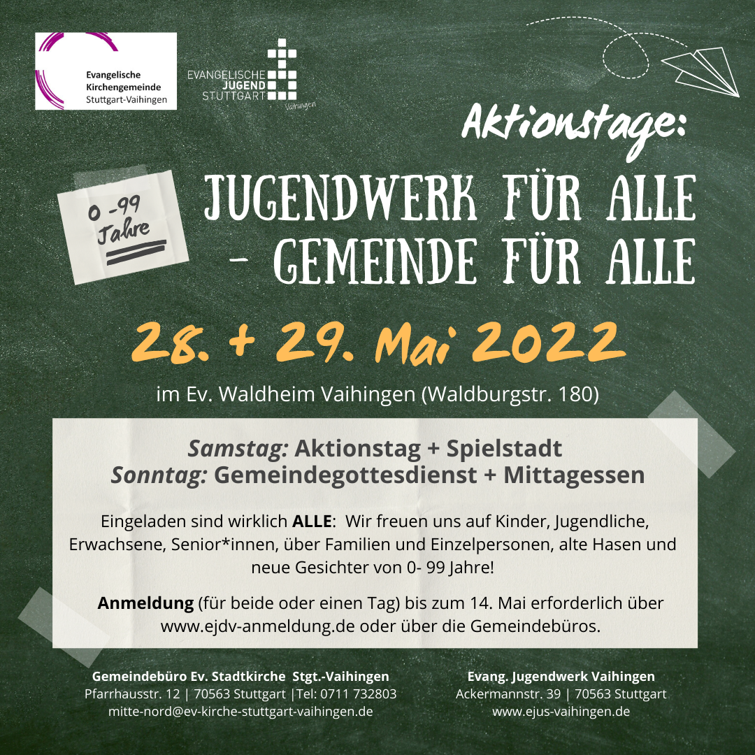 28.05.2022 - Aktionstag mit Spielstadt und großem Geländespiel Das Programm ist für alle Altersgruppen geeignet, es lässt sich variabel ein- und aussteigen. Für Verpflegung ist gesorgt. Offenes Ende am Lagerfeuer! Wo? Ev. Waldheim Vaihingen, Waldburgstraße 180 Wann? 9:30 Uhr bis 17:30 Uhr Unkostenbeitrag: Erwachsene 10 €, Kinder (ab 6 Jahre) 5 €, Familien ((Groß-)Eltern(teile) mit Enkel:innen/Kindern) 25 €